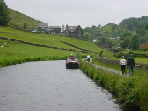 Shaw Wood Road, leading up to Mankinholes, crosses the lock tail bridge of Shawplains Lock. The bridge has evidence of blue paint from the buses which cross it.