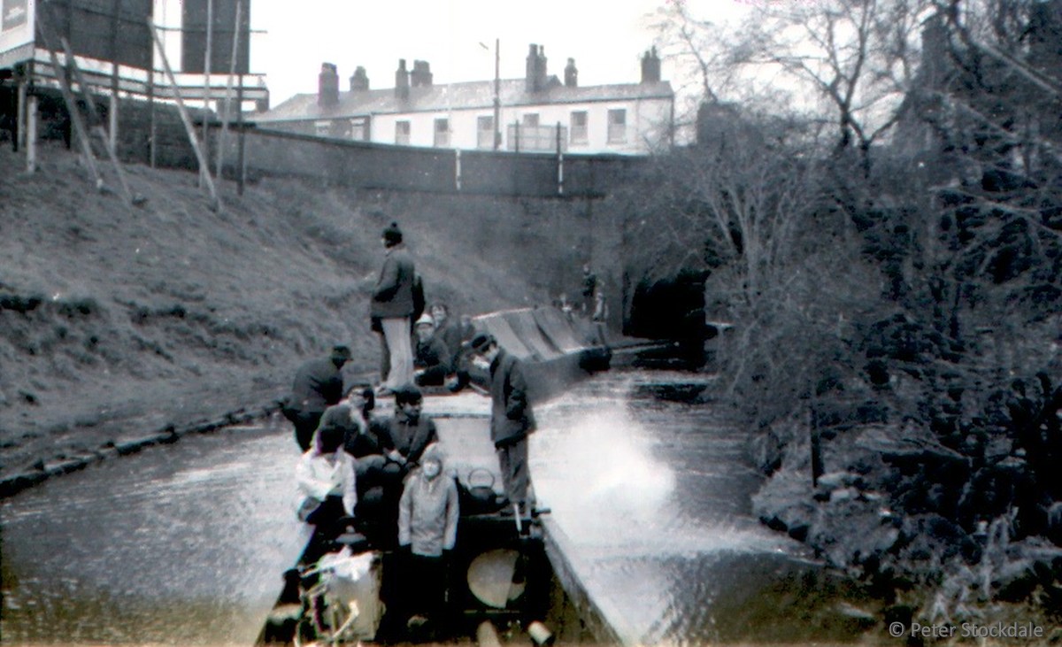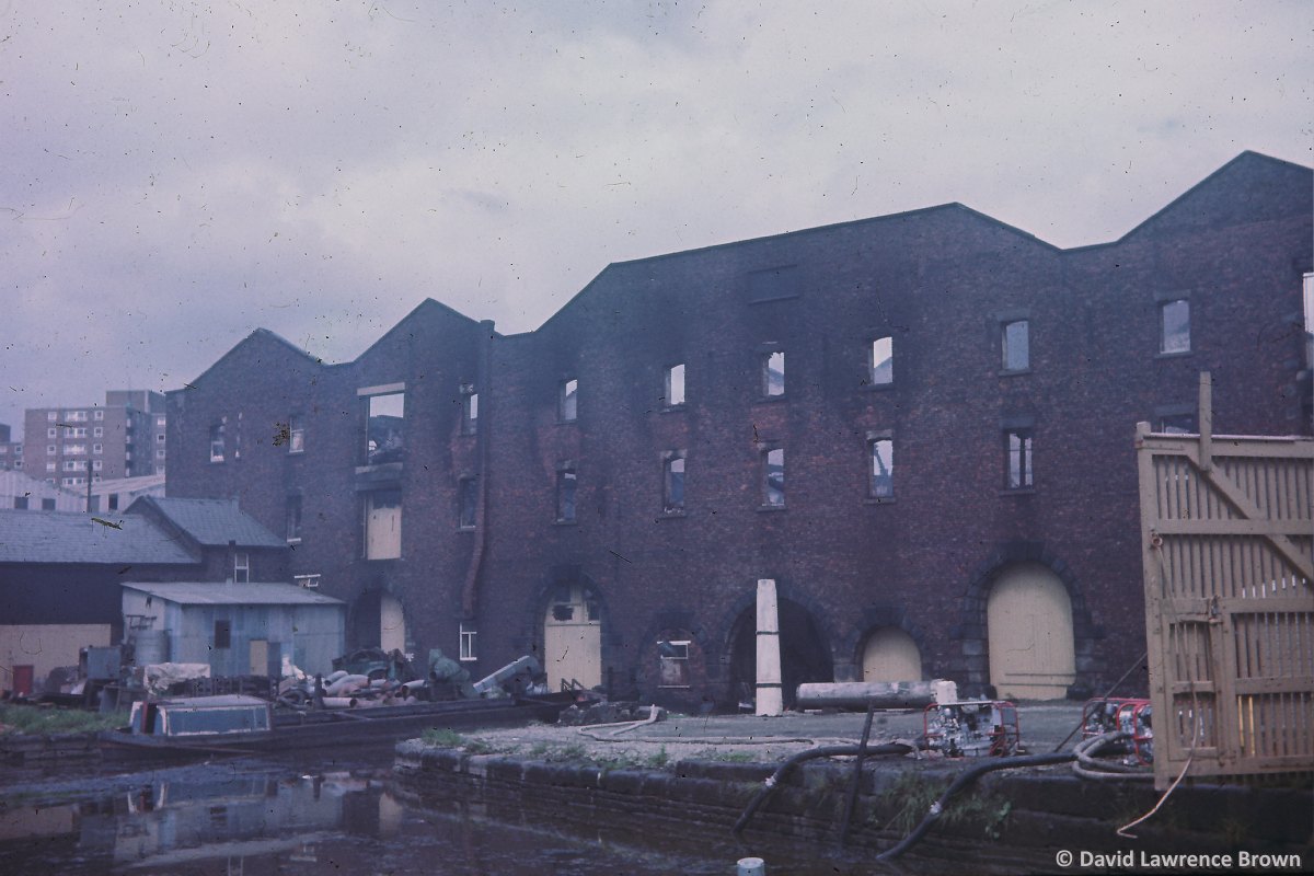 Portland Basin, showing the Ashton Canal Warehouse after the fire which destroyed it in 1972. The boat in the picture is
