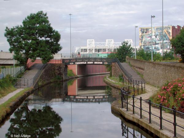Throstle Nest Bridge with Old Trafford football stadium in the background.