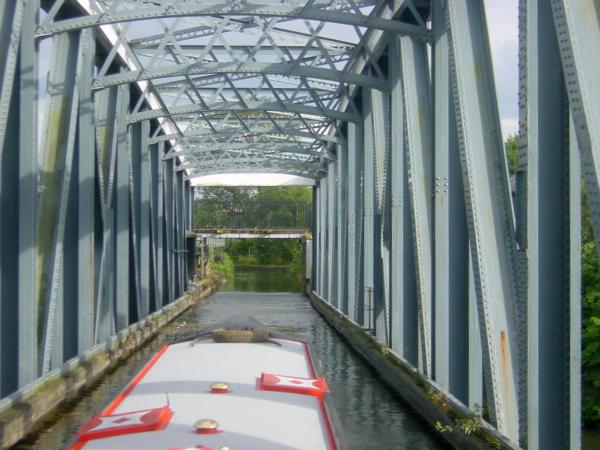 Crossing the Barton Swing Aqueduct. The whole aqueduct swings round 90 degrees to allow ships to pass along the Manchester Ship Canal below.