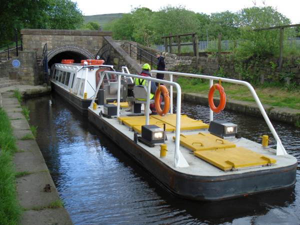 The gates across the tunnel portal at Diggle show a representation of a boat being legged through the tunnel. When the tunnel was constructed, it had no towpath, so the boats had to be propelled through the tunnel by human leg power. The leggers would lie on boards across the boat and walk along the tunnel sides.