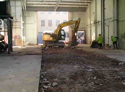 By Easter, 2000, work in the teasing shed was complete and the contractors had started work in the carding shed, which has even less headroom. The canal had been filled with large rocks and stones, which had to be removed before the 600mm diameter concrete piles could be cast.