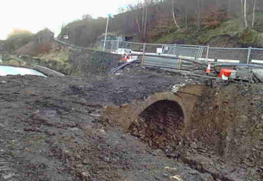 The western side of the old Mark Bottoms Bridge has re-appeared, after being buried under the road embankment. The parapets have gone but the arch structure appears to be intact.