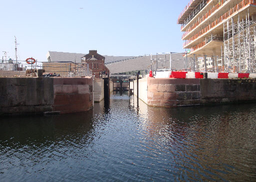 Looking out of Mann Island Lock towards Canning Dock. The difference in level at this lock varies according to the water level in Canning Dock. There is a third set of gates, shown here, which can be closed to act as floodgates when the water level in Canning Dock is higher than in the Canal Link, as it can be after a high tide.