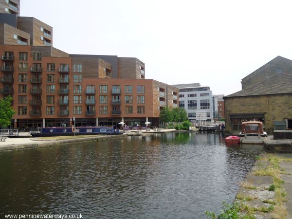 Looking west at River Lock, Leeds, with modern buildings towering over Granary Wharf.