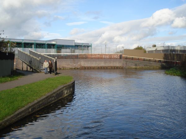 A pipe bridge crossing the canal between the two Poolstock Locks.
