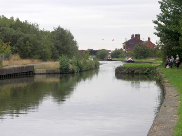 Approaching the site of the former Dover Locks, Abram. When a new canal channel was constructed to compensate for mining subsidence, the level was lowered between Poolstock and Dover, so the canal now passes straight through the narrows that were once the chambers of the two Dover Locks.